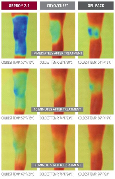 La compresión activa de Game Ready exprime los mayores beneficios solo de la terapia de frío. Las envolturas circunferenciales anatómicas de Game Ready cubren el sitio de la lesión o de la cirugía y luego se ajustan a los contornos del cuerpo con compresión neumática, asegurando un mejor contacto superficial y por lo tanto una refrigeración más efectiva. Las imágenes térmicas infrarrojas de cabeza a cabeza muestran que Game Ready proporciona una terapia más rápida, profunda y duradera que otros productos.
