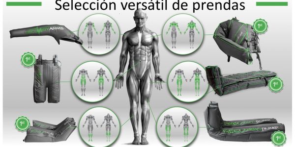 RecoveryPump® se distingue por ofrecer las prendas más revolucionarias del mercado por sus diseños de nivel superior, y porque alcanzan mayor eficiencia en el rendimiento y una mayor confortabilidad. Junto con los populares RecoveryBoots®, RecoveryCore® y RecoveryArm®, las nuevas RecoveryPants y Half-Jacket de 8 cámaras se han convertido rápidamente en la opción preferida de los deportistas de élite. Ademas ofrece otros accesorios como son fundas de protección de las unidades RP, una gama amplia de bolsas para transportar los dispositivos y las prendas, y varias opciones de sillas para recibir la terapia de forma cómoda y relajada